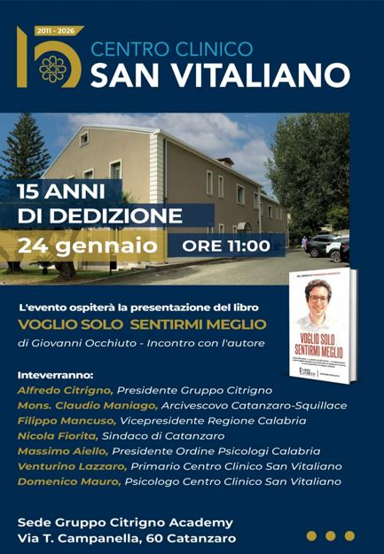 In occasione dell’anniversario, ospiteremo la presentazione del libro “Voglio solo sentirmi meglio” di Giovanni Occhiuto, un momento di riflessione aperto sul tema della salute mentale, della fragilità psicologica e del bisogno di una cura più consapevole e senza stigma.
