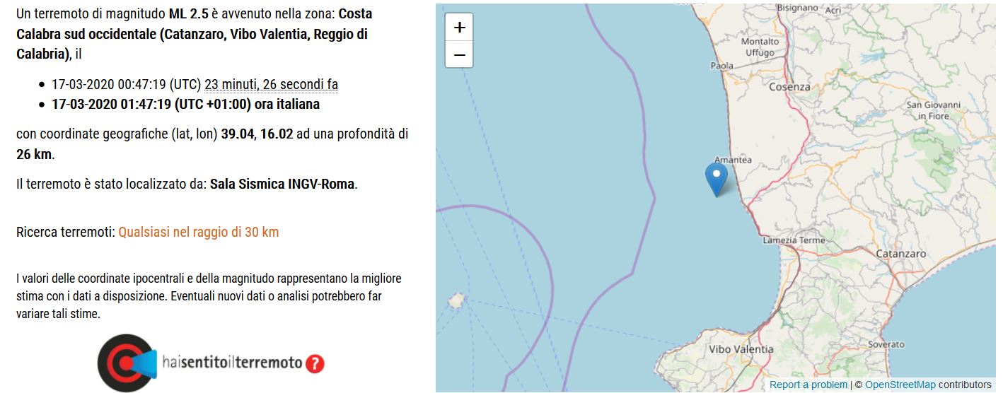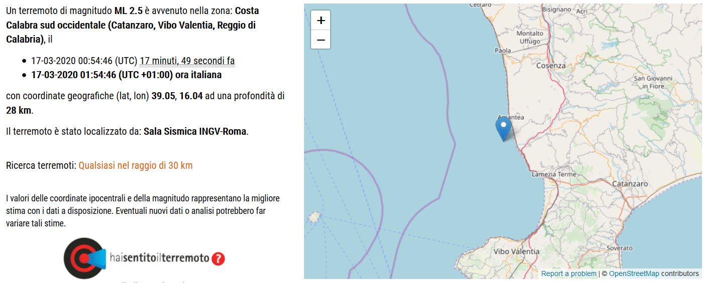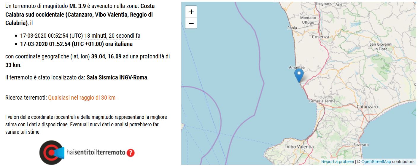 Epicentro sulla costa tirrenica nei pressi di Amantea