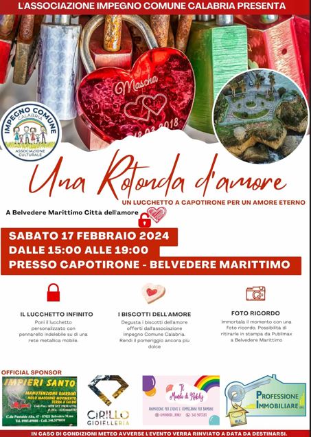 “Una Rotonda d’amore” mira a celebrare, nella città che ospita le reliquie di San Valentino, la vera essenza dell’amore eterno, e – per la prima volta a Belvedere Marittimo – come accade in tante città italiane, offre la possibilità agli innamorati di porre su una struttura mobile in maniera gratuita un lucchetto del culto, dove saranno incisi con pennarello indelebile le iniziali dell’amato-amata.