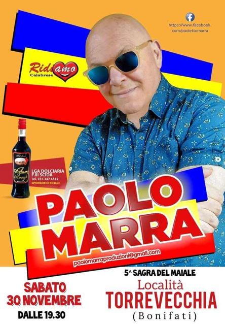 La quinta edizione della Sagra del Maiale avrà un vasto programma e prevede infatti dalle ore 19:30 l’apertura degli stand gastronomici. Uno spettacolo musicale gratuito, momenti di svago, e l’atteso show di Paolo Marra. Il simpaticissimo e poliedrico artista cosentino presenterà infatti “Carminella ‘a scasciata-Jamu ch’è rifriddatu” con Francesco Magurno.
