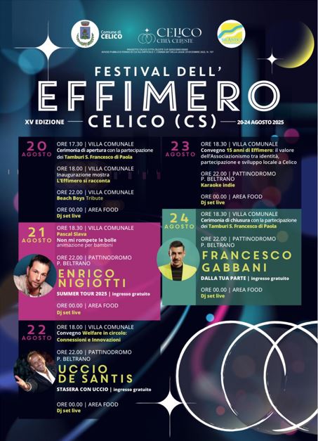 Il Festival dell’Effimero rientra nel Progetto ‘Celico città celeste’ finanziato dal Ministero del Turismo a valere sull’ “Avviso pubblico sul fondo di cui all’articolo 1, comma 607 della legge 29 dicembre 2022, n. 197, destinato a finanziare progetti di valorizzazione dei comuni con popolazione inferiore a 5.000 abitanti, classificati dall’Istituto Nazionale di Statistica come comuni a vocazione turistica, al fine di incentivare interventi innovativi di accessibilità, mobilità, rigenerazione urbana e sostenibilità ambientale”.