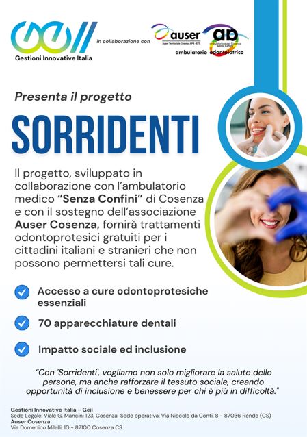 La mission del progetto, realizzato da Gestioni Innovative Italia (Geii) e l’Auser Territoriale di Cosenza, è quella di garantire l’accesso a cure dentali essenziali per le persone che vivono in situazioni di vulnerabilità, restituendo loro la dignità e la possibilità di condurre una vita più sana e inclusiva.