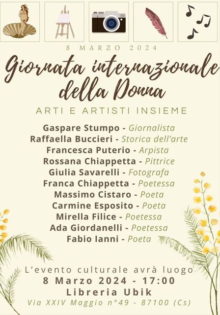 In occasione della Giornata internazionale della donna, l’8 marzo prossimo, si terrà, alle ore 17:00, un interessante e ricco evento culturale presso la libreria Ubik di Cosenza, dal titolo “Arti e artisti insieme”