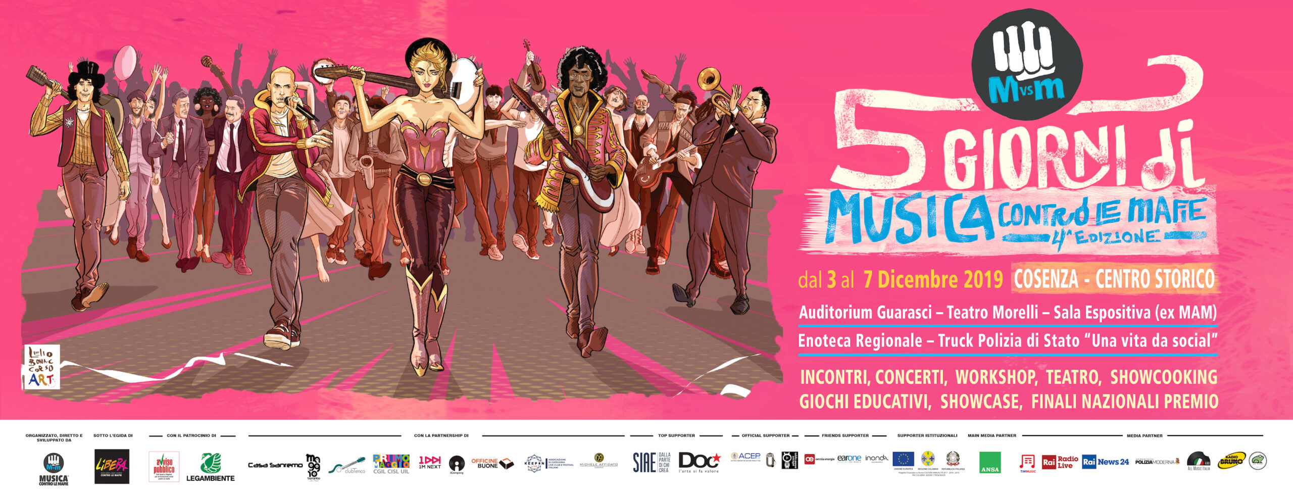 Dal 3 al 7 dicembre 2019 si svolgerà a Cosenza la “5 Giorni di Musica contro le mafie” che dopo aver comunicato la presenza di Willie Peyote, Antonio Nicaso, Lirio Abbate, Giorgio Poi e Margherita Vicario si arricchisce ulteriormente di contenuti musicali, cinematografici, teatrali con panel e workshop dedicati agli studenti e ai ragazzi provenienti da tutta Italia. Cosenza diventa così teatro di incontri, proiezioni, giochi educativi, mostre, concerti, showcase [e le finali nazionali del Premio omonimo]; tesi a tenere viva la memoria delle vittime innocenti di mafie.