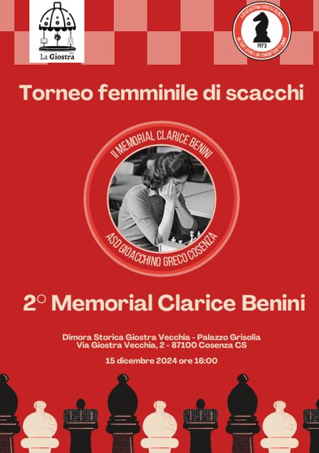 L’A.S.D. Gioacchino Greco di Cosenza invita tutte le scacchiste (presenti, passate e future) domenica 15 dicembre 2024 alle ore 16:00, per celebrare una particolare giornata dedicata alle Donne, al Torneo Femminile – 2° Memorial Clarice
