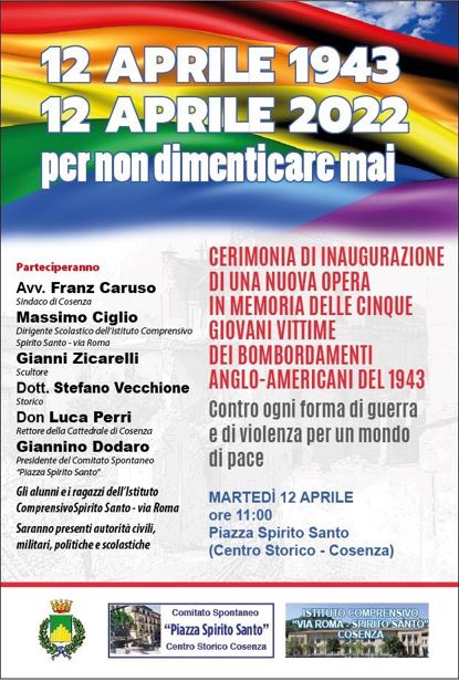 Il 12 aprile 2022 in Piazza Spirito Santo verrà inaugurata la nuova opera in ricordo delle vittime dei bombardamenti alla presenza delle istituzioni locali, religiose, militari e dei ragazzi dell’Istituto comprensivo statale “Spirito Santo”.