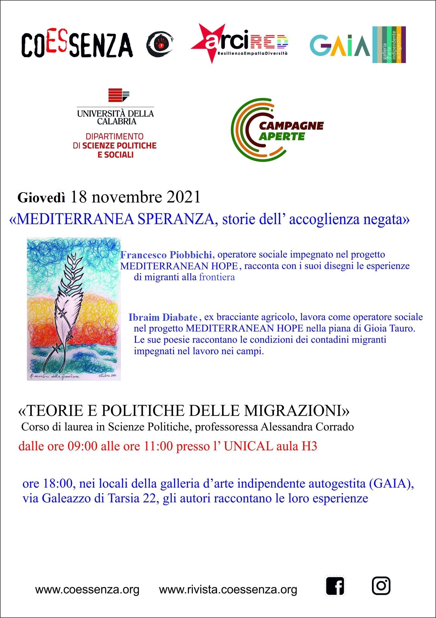 Coessenza, Arci Red, Associazione GAIA (Galleria d’Arte Indipendente Autogestita) e il Dipartimento di Scienze Politiche e Sociali dell’Università della Calabria, giovedì 18 novembre, alle ore 18.00, presso la sede dell’associazione GAIA, in via Galeazzo di Tarsia 22, presentano “Mediterranea Speranza. Storie dell’accoglienza negata”