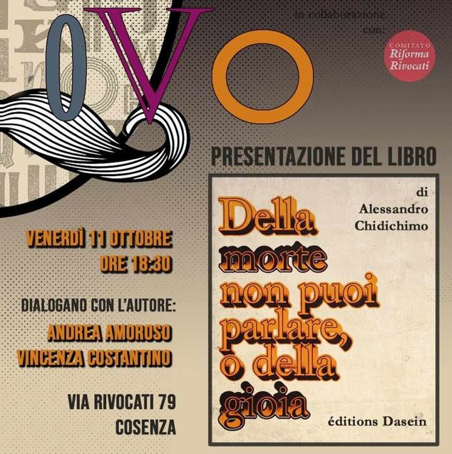 Venerdì 11 Ottobre 2024 alle ore 18.30 si terrà, presso gli spazi di Ovo Officina Visuale Orizzontale in via Rivocati 79, la presentazione del nuovo libro di Alessandro Chidichimo “Della morte non puoi parlare, o della gioia”, Dasein Edizioni