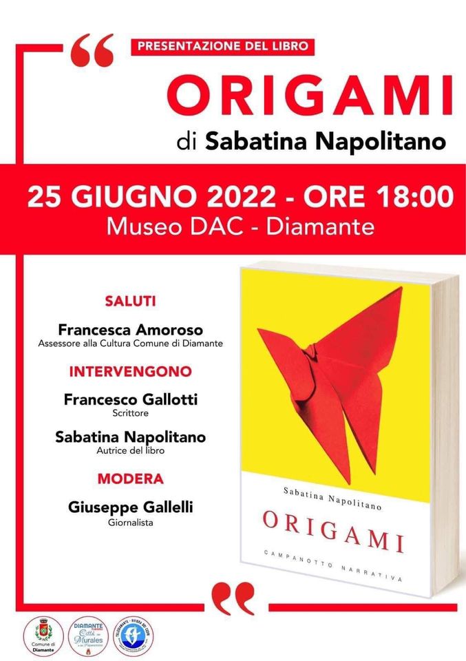 La scrittrice Sabatina Napolitano, sabato 25 giugno alle 18.00 al Museo Dac di Diamante, presenterà Origami insieme a Francesco Gallotti (scrittore), Pippo Gallelli (giornalista) e l’assessore Francesca Amoroso