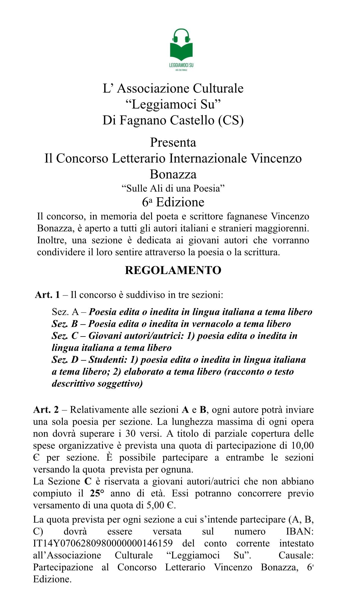 A tutti i Poeti e gli amanti della Poesia, “Leggiamoci Su” è lieta di annunciare l’apertura delle iscrizioni al Concorso Letterario Vincenzo Bonazza “Sulle Ali di una Poesia” giunto alla sua sesta edizione