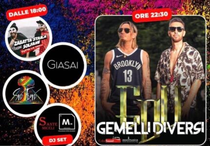 La serata partirà dalle ore 18:00 con la Zabatta crew, a seguire si esibiranno 2 band appartenenti al territorio, i Syd Floyd e i Giasai, riscalderà il pubblico prima del grande concerto Dj Sante Miceli per concludere alle ore 22:30 con l’arrivo dei Gemelli Diversi.