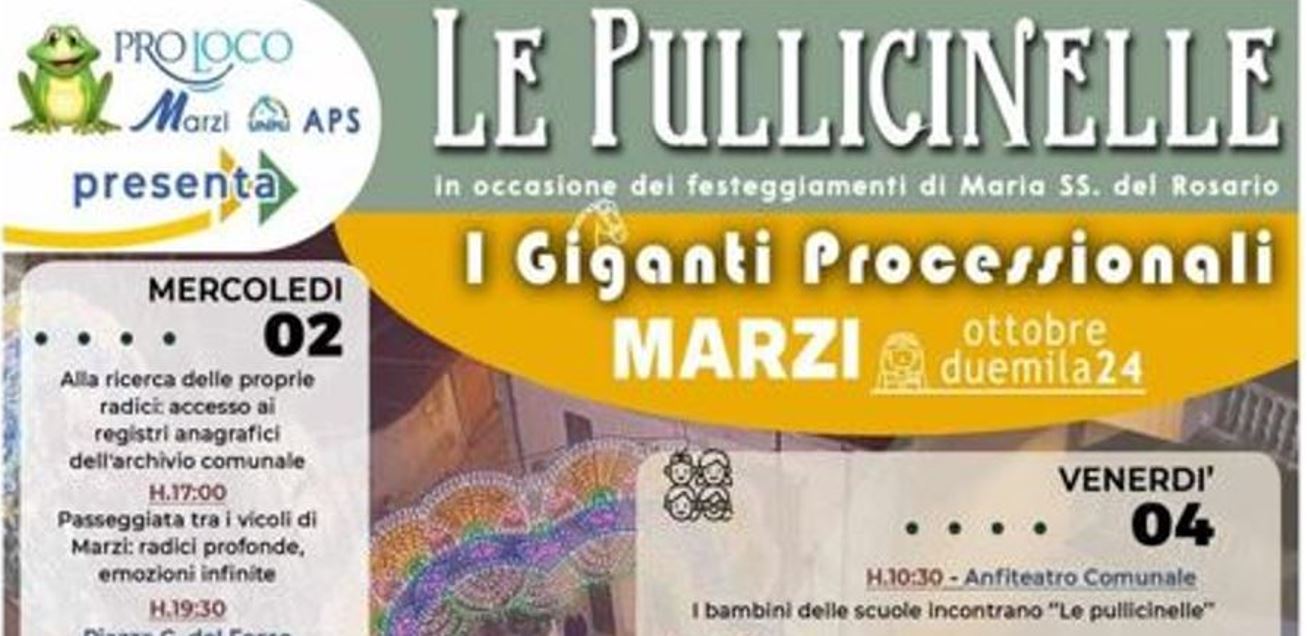 H.21:00: *Sfilata dei Giganti Processionali di Marzi “Le Pullicinelle”* accompagnati da *I Tamburi della Sila*