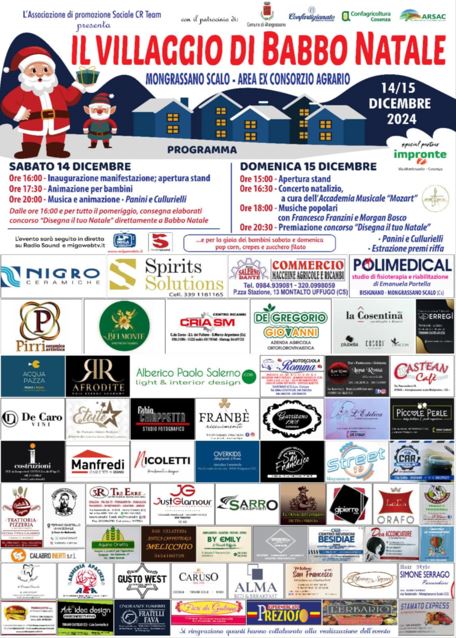 L’associazione di promozione sociale CR Team con il patrocinio dell’amministrazione Comunale di Mongrassano, di Confartigianato Cosenza, Confagricoltura Cosenza e ARSAC, invita tutti a visitare il “Villaggio di Babbo Natale” il 14 e 15 dicembre a Mongrassano Scalo