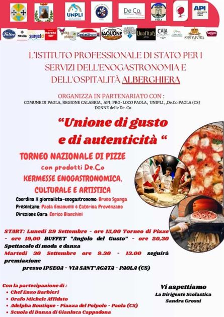L’Istituto Professionale di Stato per i servizi dell’enogastronomia e dell’ospitalità Alberghiera organizza in collaborazione con il Comune di Paola, la Regione Calabria, API, Pro Loco, Unpli, De. Co Paola e Donne delle De. Co, una vera e propria Unione di gusto e autenticità: il Torneo nazionale di Pizza con Prodotti De.Co – Kermesse enogastronomica culturale e artistica