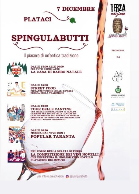 Ricca questa terza edizione di Spingulabutti, ne abbiamo per tutte le età e per tutti i gusti. Iniziamo dal pomeriggio con l’accoglienza dei partecipanti della camminata per Antonio, poi la casa di Babbo Natale per allietare i bambini ed infine musica e balli con il gruppo Popular Taranta.