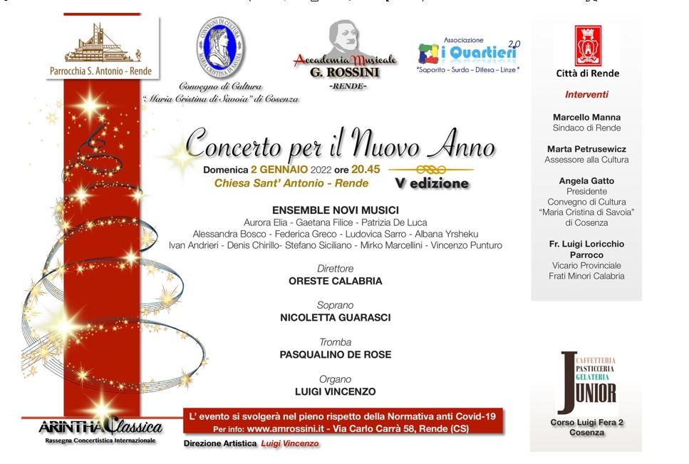 Sempre nella Chiesa S. Antonio si terrà poi il “Concerto per il Nuovo Anno”, in programma domenica 2 gennaio 2022 alle 20.45. L’iniziativa, giunta ormai alla V edizione, vedrà l’esibizione dell’Ensemble Novi Musici diretta dal M. Oreste Calabria con i Maestri Nicoletta Guarasci (soprano), Pasqualino De Rose (tromba) e Luigi Vincenzo (organo) in qualità anche di direttore artistico.