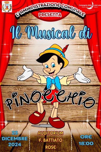 L’Amministrazione Comunale è lieta di presentarvi, il 23 dicembre alle h 18 presso l’auditorium F. Battiato a Rose (Cs), al Musical di Pinocchio