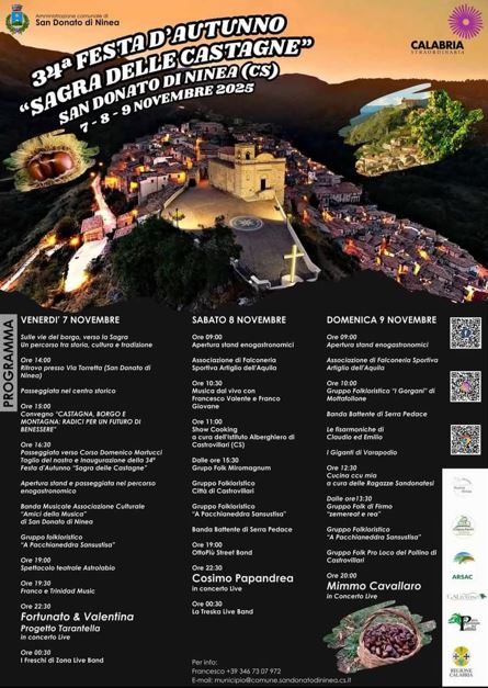 A San Donato di Ninea, piccolo borgo nel Parco Nazionale del Pollino, il 7-8-9 novembre si celebra la ormai conosciutissima Festa Dโ€™Autunno, Sagra delle Castagne, arrivata alla 34ยช edizione