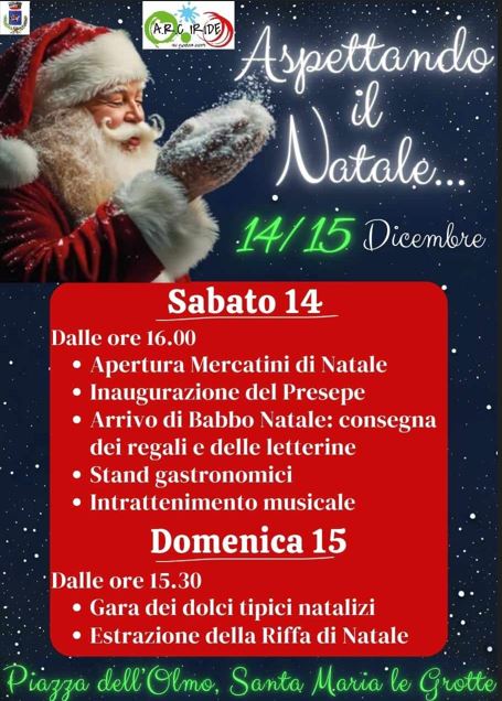 L’Associazione Iride è lieta di invitare tutti a partecipare all’evento “Aspettando il Natale”, che si terrà il 14 e 15 dicembre nella suggestiva Piazza dell’Olmo a Santa Maria le Grotte (CS)