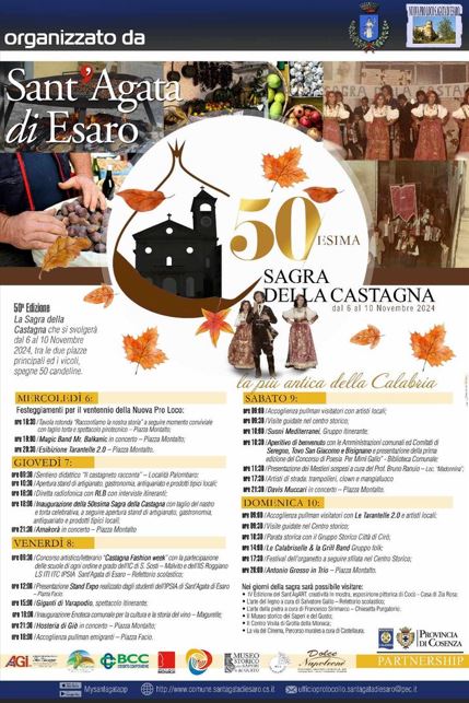 Dal 6 al 10 novembre, la Sagra della Castagna, animerà il centro storico di Sant’Agata di Esaro con stand enogastronomici, artigianato, spettacoli e iniziative culturali.