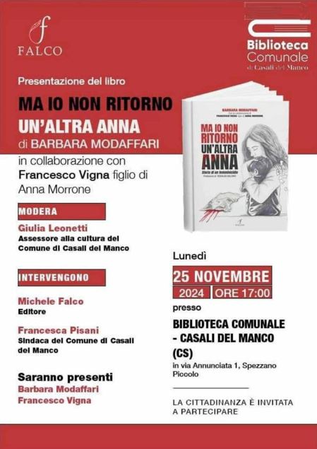Amministrazioni comunali e associazioni culturali si stanno dedicando al confronto e alla prevenzione sul tema della violenza di genere, invitando, al tavolo della discussione gli esperti della materia. Partendo da un femminicidio accaduto a Cosenza, si affronta un problema che interessa oggi, quotidianamente, tutta la società. L’amministrazione comunale di Fuscaldo ha dato il via a questo progetto, per essere seguita il 24 dal comune di San Lucido. Il 25, giornata contro la violenza sulle donne, sarà a Casali del Manco, paese di adozione di Anna Morrone, ad ospitare il figlio della protagonista, Francesco, che insieme all’autrice del libro, converseranno con gli ospiti. Seguiranno Paola, San Giovanni in Fiore e Rovito, in una fitta sequenza che palesa la necessità di ogni cittadino di poter conoscere dinamiche e strategie per contrastare il fenomeno dilagante della violenza di genere.