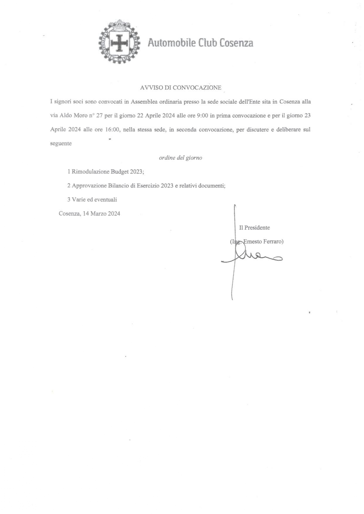 I signori soci sono convocati in Assemblea ordinaria presso la sede sociale dell’Ente sita in Cosenza alla via Aldo Moro n° 27 per il giorno 22 Aprile 2024 alle ore 9:00 in prima convocazione e per il giorno 23 Aprile 2024 alle ore 16:00, nella stessa sede, in seconda convocazione, per discutere e deliberare sul seguente