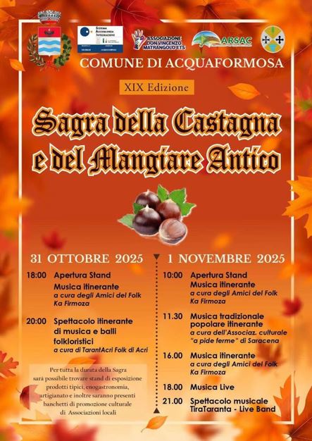 Il 31 ottobre e 1° novembre 2025, Acquaformosa (CS) accende i riflettori sulla tradizione con la XIX edizione della “Sagra della Castagna e del Mangiare Antico”: un appuntamento ormai irrinunciabile per gli amanti della buona cucina, della cultura popolare e dell’atmosfera autentica dei borghi calabresi