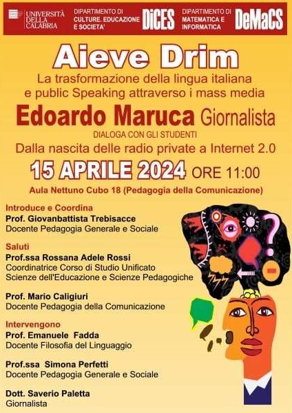Aieve Drim, infine, è il titolo dell’iniziativa curata dal giornalista Edoardo Maruca e svoltasi il 15 aprile nel cubo 18 dell’Università della Calabria. Il dibattito, organizzato dal Dices (Dipartimento di culture, educazione e società) e dal Demacs (Dipartimento di matematica e informatica) dell’Unical, è stato dedicato, come spiega meglio il sottotitolo, a “La trasformazione della lingua italiana e del public speaking attraverso i mass media”.