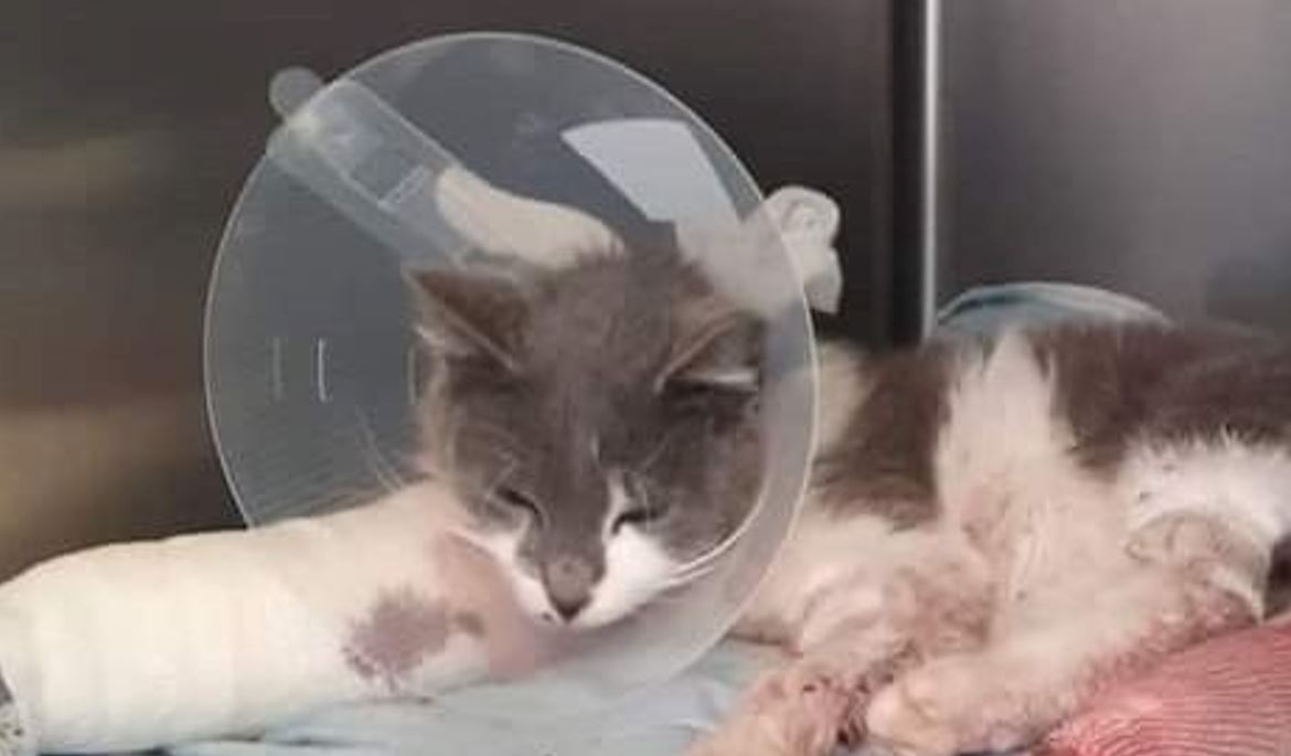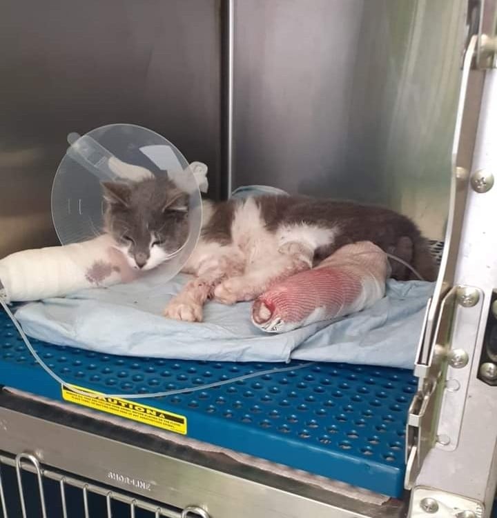Ha tutti e quattro gli arti fratturati e la zampa posteriore destra deve essere amputata perché totalmente maciullata.