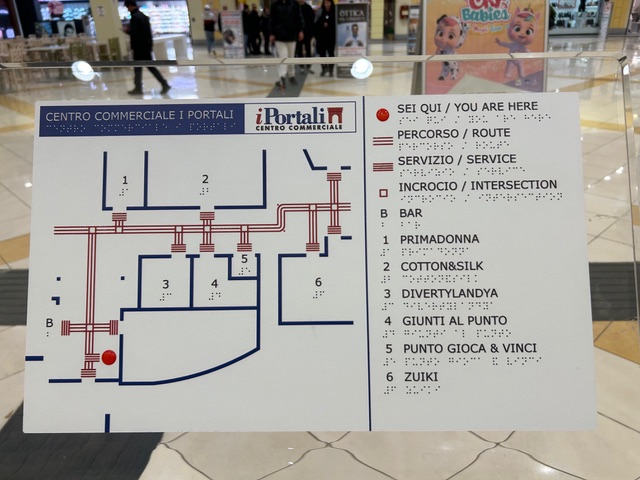 Infatti, all’interno delle mappe è riportata in rilievo, sia in nero che in segnatura Braille, la collocazione di ciascun negozio o servizio. Basterà seguire il percorso tattilo-plantare attraverso la guida dell’apposito bastone bianco per raggiungere ogni punto di interesse.