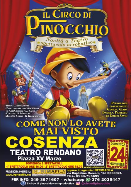 Un Pinocchio come non lo avete visto mai. Al teatro “Rendano” di Cosenza, domenica 24 Novembre, la magia e l’incanto del “Circo di Pinocchio”, live organizzato dalla Savio Production, per la regia di Daniela Bruschetta