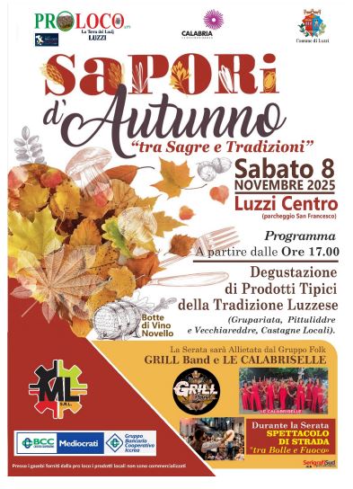 Sabato 8 novembre la Pro Loco “La Terra dei Lucij”, con il patrocinio del Comune di Luzzi – Dipartimento Sport e Spettacolo, organizza la 6ª edizione della “Sagra dei Sapori d’Autunno”, un appuntamento ormai tradizionale che celebra i profumi e i sapori tipici della stagione