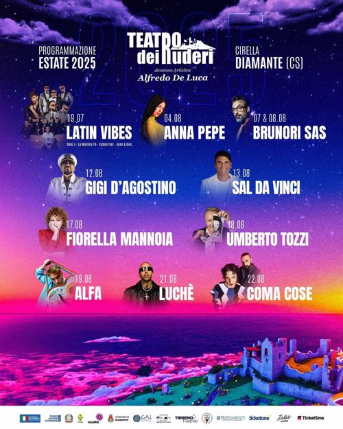 “Ripetersi o far meglio è sempre una sfida – ha dichiarato Alfredo De Luca – ma ogni anno, insieme al team organizzativo, alle Autorità e agli Enti coinvolti, lavoriamo senza sosta per offrire al pubblico un’esperienza indimenticabile. Il Teatro dei Ruderi è ormai parte del circuito dei migliori festival italiani, un traguardo raggiunto grazie all’impegno costante per la valorizzazione del sito. Il festival deve essere uno stimolo di vacanza per i turisti che scelgono la nostra costa per vivere musica e cultura in uno scenario unico”.