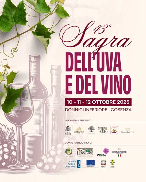 Organizzata dall’Associazione Culturale Vivi Donnici, con il patrocinio del Comune di Cosenza, la manifestazione celebra la tradizione vitivinicola e l’identità culturale di Donnici, terra di vigne, sapori autentici e memoria contadina.