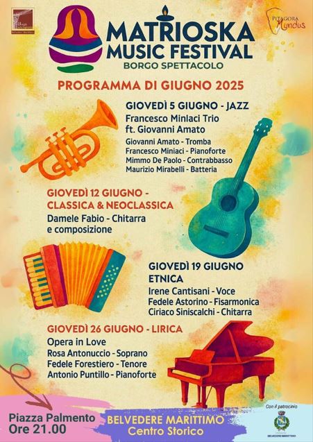 A Belvedere Marittimo nasce una nuova stagione culturale aperta a tutti: è il Matrioska Music Festival – Borgo Spettacolo, una rassegna musicale che animerà il centro storico del paese ogni giovedì sera, da maggio a ottobre 2025 (escluso agosto)