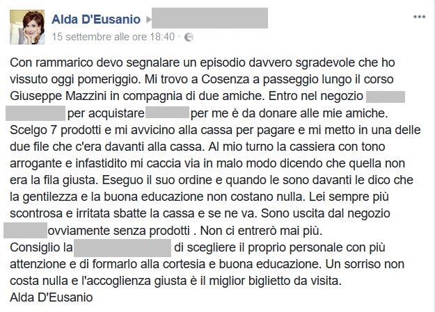 Pochi giorni fa la nota giornalista e conduttrice televisiva italiana è stata a Cosenza …e dopo una passeggiata su Corso Mazzini e qualche acquisto di qua e di là …ha rilasciato una recensione negativa su un negozio …che sta facendo infuriare alcuni cosentini, i quali smentiscono e difendono le commesse, accusando la D’Eusanio di “abuso di notorietà”.