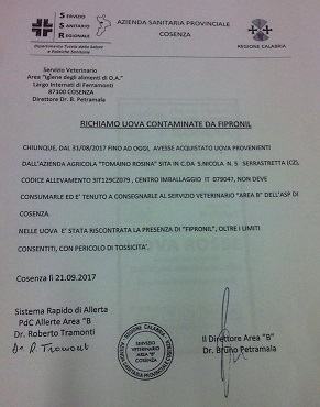 “Chiunque avesse acquistato uova provenienti Uova fresche CAT. A del marchio UOVA ROSSE Azienda Agricola Tomaino Rosina; Nome o ragione sociale dell’OSA con cui il prodotto è commercializzato: AZIENDA AGRICOLA TOMAINO ROSINA – Serrastretta (Cz) località San Nicola n. 5; Lotto di produzione: le uova riportano stampigliato il cod. 3IT129CZ079; marchio di identificazione dello stabilimento: IT 079047; data di scadenza o termine minimo di consumazione: preferibilmente entro 28 giorni dalla data di ovo deposizione. Descrizione peso / volume unità di vendita: confezione da 30 uova. E’ tenuto a consegnarle al servizio veterinario di “Area B”dell’Asp di Cosenza.