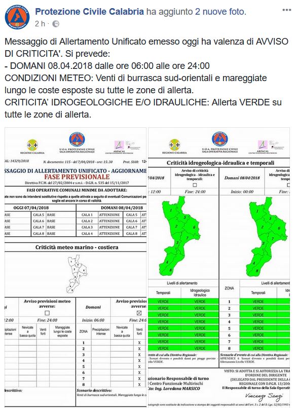 Il bollettino diffuso poco fa dalla Protezione Civile Calabria: