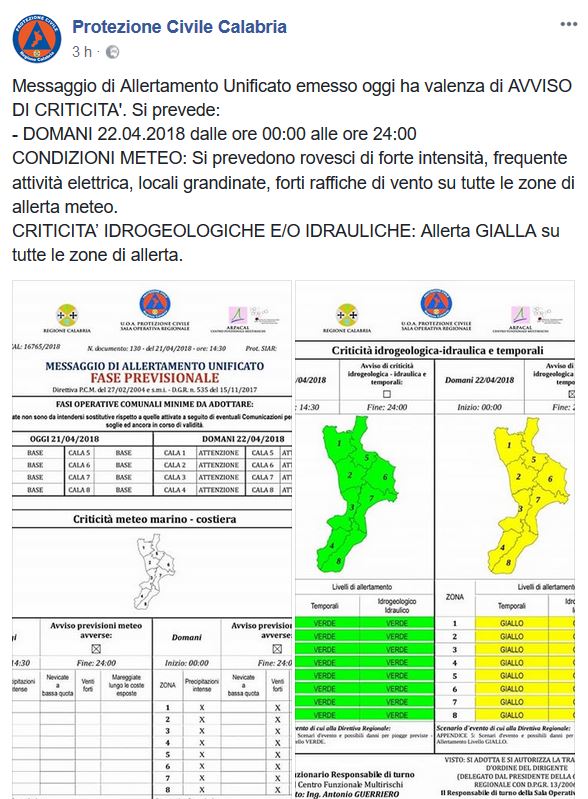 “Messaggio di Allertamento Unificato emesso oggi ha valenza di AVVISO DI CRITICITA’. Si prevede: