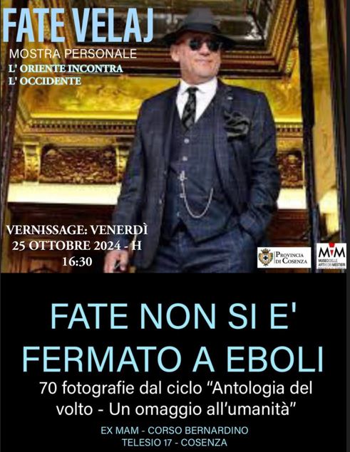 La Provincia di Cosenza ha voluto omaggiare l’Ambasciatore – artista dei volti catturati oltre il mero obiettivo fotografico, testimoni dei problemi e delle sfide della contemporaneità – allestendo presso le Sale Espositive dell’Ente (ex MAM) una sua mostra personale fotografica dal titolo “Fate non si è fermato ad Eboli”, 70 fotografie dal ciclo “Antologia del volto – un omaggio all’umanità”.