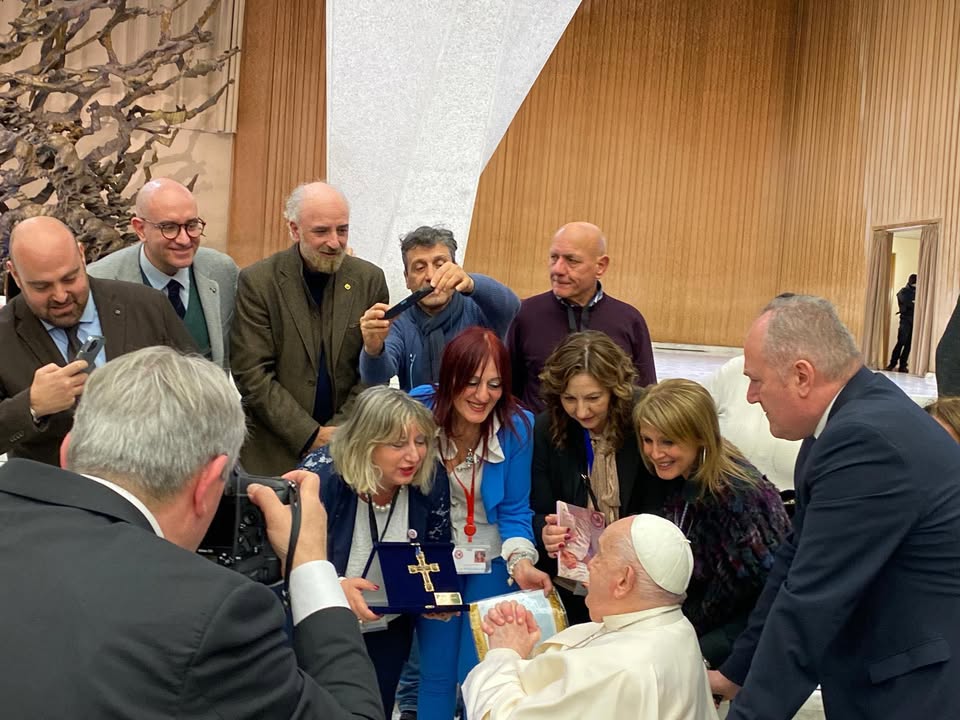 La presidente, Anna Maria Rende, ha portato i saluti dei pazienti oncologici assistiti dall’associazione e dei tanti detenuti incontrati. Inoltre la Presidente Rende ha donato a Papa Francesco una pregevole riproduzione della “Stauroteca”, il famoso reliquiario conservato nel museo diocesano di Cosenza.