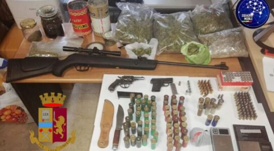 “La perquisizione è avvenuta presso l’abitazione dell’uomo, dove, oltre ad altra sostanza stupefacente del tipo marijuana, ad una carabina ad aria compressa con ottica di precisione, a un pugnale, a un barattolo di vetro contenente olio di marijuana e a due bilancini di precisione, gli agenti rinvenivano e sequestravano anche un revolver marca cal. 32 e una pistola semiautomatica marca Regina cal. 6,35, ambedue sprovvisti di matricola.”