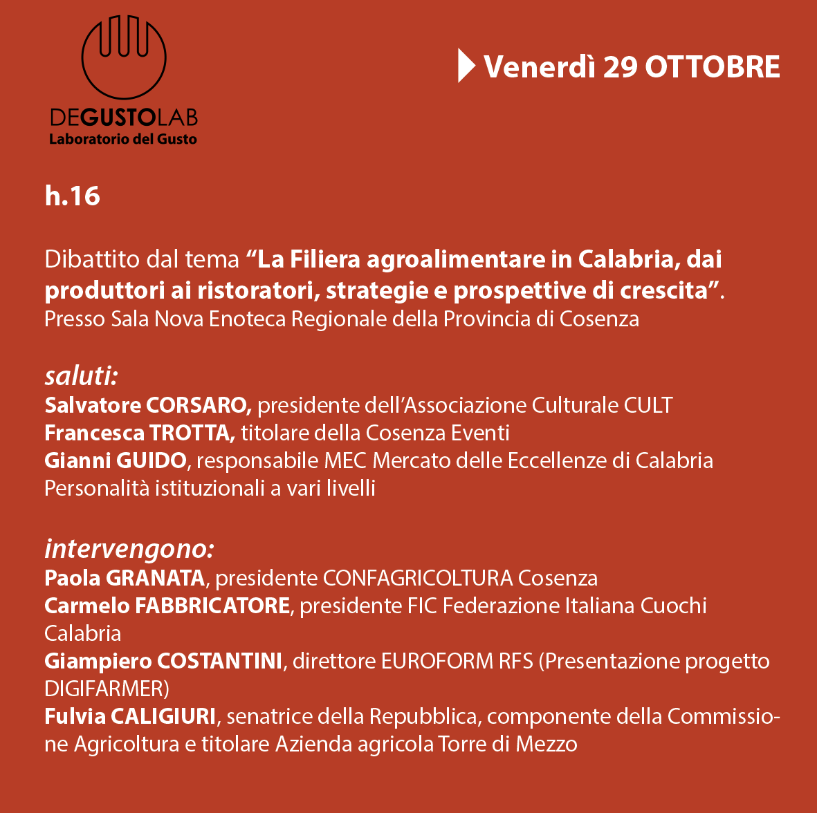 Il salone si terrà presso l’ex MAM (Museo delle Arti e dei Mestieri) nella splendida cornice del centro storico di Cosenza dal 29 al 31 ottobre 2021, proponendosi ad un pubblico curioso e attento al mondo del food&beverage e ad Aziende e Professionisti qualificati locali e nazionali, al fine di poter garantire la qualità, l’originalità e l’unicità del made in Italy.