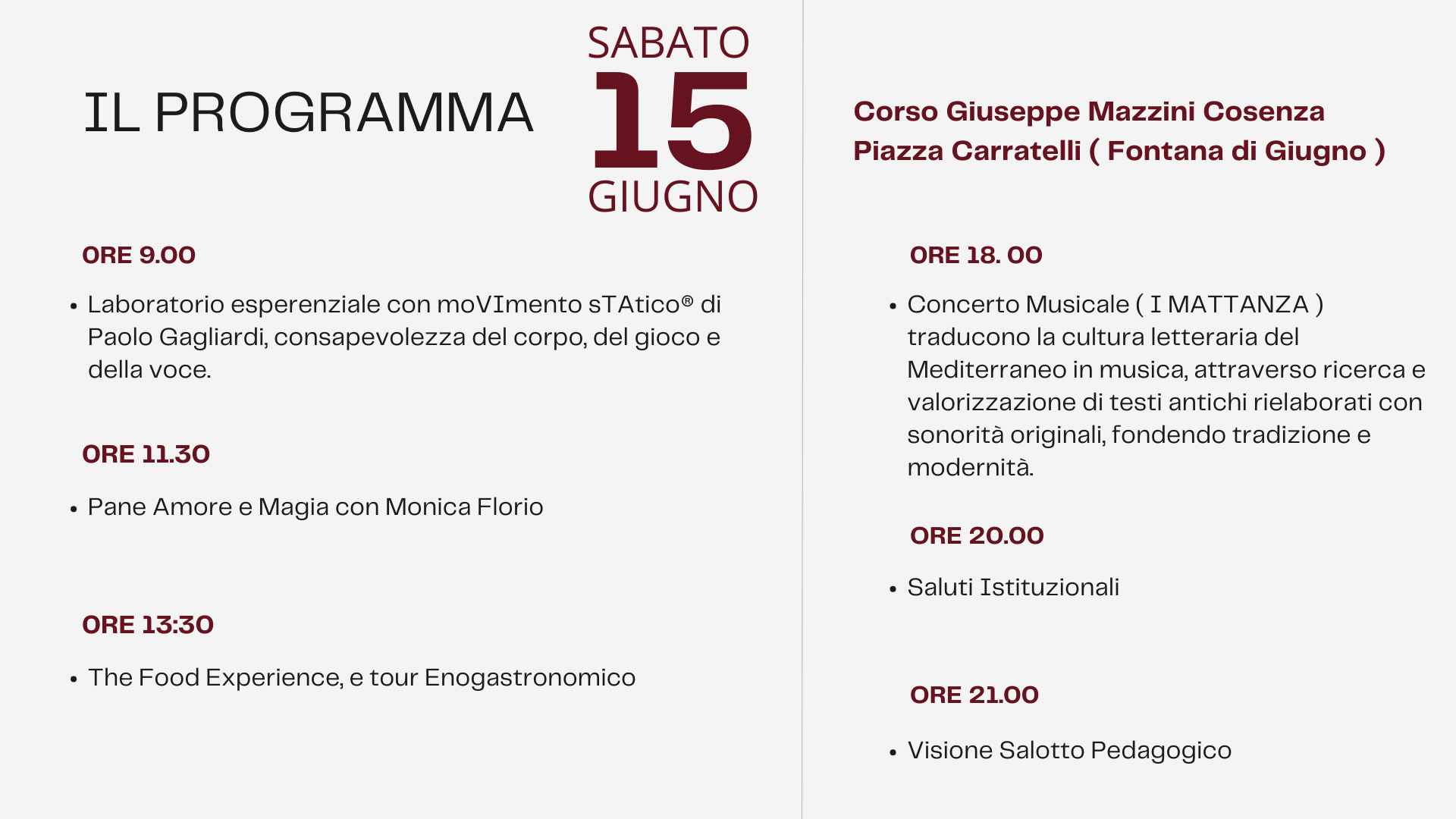 L’evento si svolgerĂ  in un luogo suggestivo, ideale per ospitare tematiche socio-culturali. Grazie a un allestimento appositamente studiato, creeremo un’atmosfera di armonia e convivialitĂ  per tutti i partecipanti. Durante la giornata sono previsti eventi collaterali che coinvolgeranno il grande pubblico, con momenti enogastronomici legati alla cultura calabrese e ai piatti tipici cosentini.