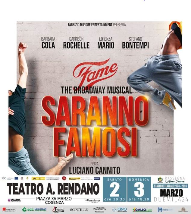““Fame – The Broadway musical – Saranno Famosi –” arriva al Teatro Rendano di Cosenza. Unica tappa calabrese per il musical cult che ha appassionato intere generazioni, un fenomeno leggendario ed intramontabile della cultura pop. Saranno Famosi è stata una delle serie tv più famose e indimenticabili, ma anche un film e un musical di successo internazionale.Questa nuova versione firmata da Luciano Cannito, che unisce l’esperienza di regista a quella di coreografo internazionale, sarà un trionfo di canto, danza, musica, recitazione, in una narrazione dinamica e travolgente.