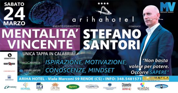 Infatti, La Marco Chiappetta Enterprise!, agenzia che si occupa di comunicazione a 360°, presenta l’evento “Mentalità vincente” a cura di Stefano Santori: il più esperto formatore italiano e coach “MINDSET”, che ci spiegherà il metodo per arrivare a comprendere e costruire la propria, personalissima, Mentalità Vincente.