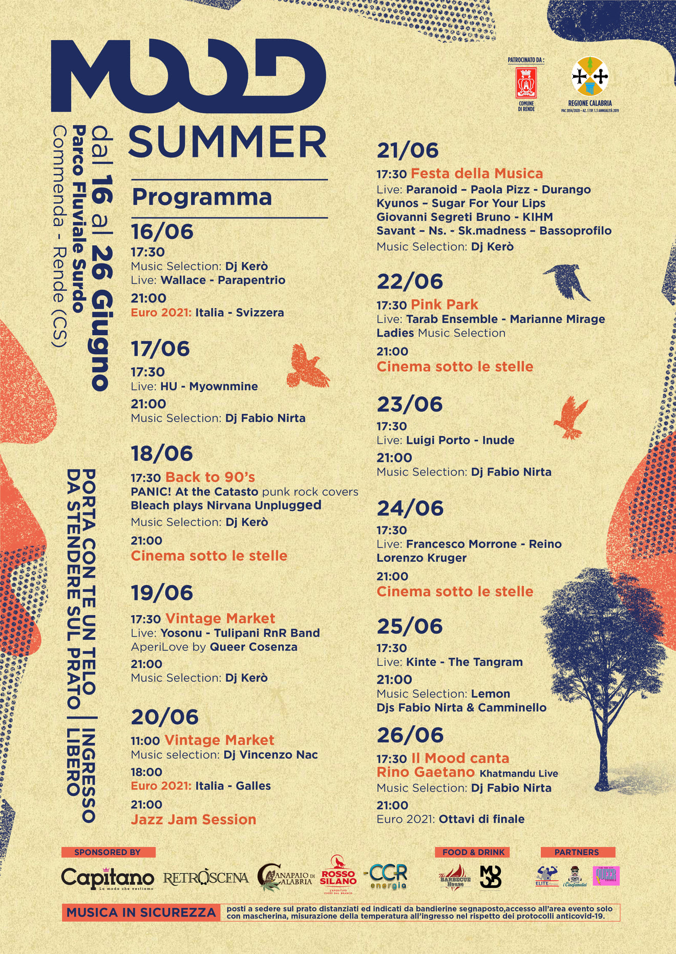Ideata e organizzata dall’associazione Mood e Mood Social Club e patrocinata dal Comune di Rende, questa rassegna di inizio estate vuole essere simbolo di ripartenza per il mondo dell’arte, della cultura, dell’intrattenimento. Ovviamente, nel pieno rispetto delle norme anti-covid: ingressi contingentati e solo con mascherina, posti a sedere sul prato distanziati e segnalati da apposite bandierine, misurazione della temperatura per l’accesso all’area evento e registro delle presenze.