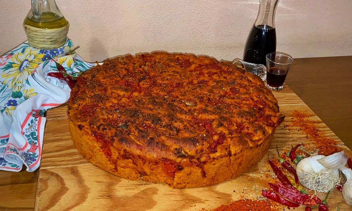 Per prepararla, infatti, è necessario bucherellare la pasta lievitata con le dita, per imbottirla dei suoi condimenti, pomodori pelati e sarde, che sono anche i componenti dell’impasto stesso; a questi si aggiungono “u pipi russu”macinato, il peperoncino (per i meno temerari ne esiste anche una versione non piccante), spezie quali origano, cannella e noce moscata, aglio, olio, farina e tanto amore…