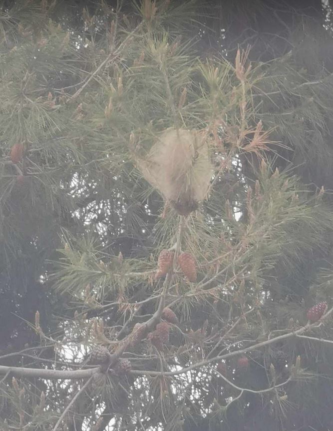 Nel pino che fa angolo nel parco (e che vi giro in foto), si vedono ancora i nidi attaccati ai rami, ma il gruppo di processionaria è stato visto al lato opposto, quindi lato Via Fratelli Bandiera, per intenderci. Ciò significa che sono già per terra i vermi e, se sono arrivati fino a lì, la villetta ne è piena.