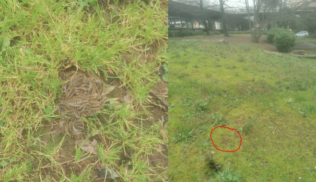 “ATTENZIONE! Processionarie molto pericolose avvistate in questo momento nel parco Corrado Alvaro a Cosenza, quello di fronte la scuola elementare De Matera, tra Via Aldo Moro e la Sopraelevata. È un parco molto frequentato da cani (e per loro può essere letale), ma anche da tantissimi bambini, vista la vicinanza alla scuola.